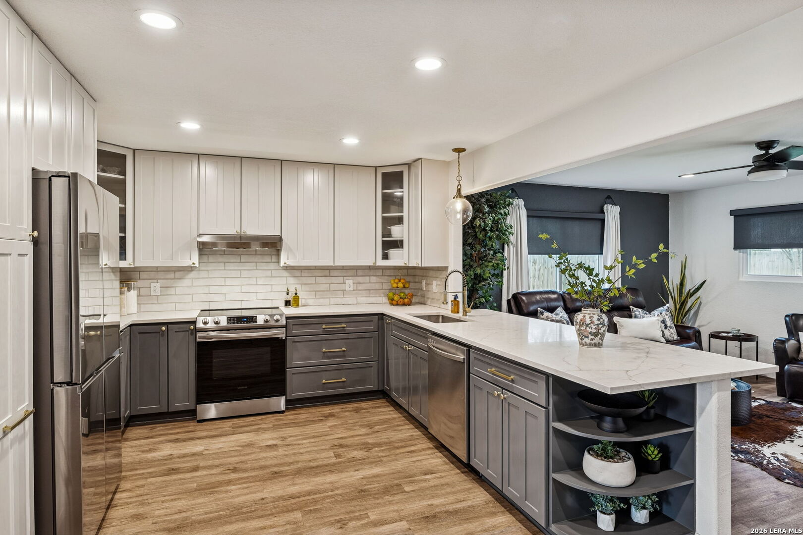 Thoughtfully renovated and ideally positioned within the loop, this refined New Braunfels residence offers the rare opportunity to enjoy a like-new home in one of the area's most desirable locations-just minutes from downtown New Braunfels and Gruene. With Torrey Park located just steps away and convenient access to dining, entertainment, and local destinations, the setting supports an effortless Hill Country lifestyle. The thoughtfully updated three-bedroom, two-bath home blends timeless design with modern comfort. Renovations include a new roof, Pella windows, updated interior and exterior doors, and whole-home flooring replacement. The reimagined kitchen and bathrooms feature custom cabinetry, quartz countertops, and a modern appliance suite-designed for both everyday living and entertaining. Recent mechanical and energy enhancements include a high-efficiency 16-SEER HVAC system, blown-in attic insulation, and a mini-split A/C added to the office or flex space, offering flexibility and year-round comfort. A finished detached barn with a new roof and completed interior build-out adds valuable versatility-ideal for recreation, entertaining, or additional usable space. Set in the heart of New Braunfels, the home is surrounded by the lifestyle that defines this iconic Hill Country town. From floating the Comal and Guadalupe Rivers to weekends at Schlitterbahn Waterpark and nearby Canyon Lake, outdoor recreation is part of everyday life. The location also offers convenient access to San Antonio and Austin, allowing residents to enjoy the charm of New Braunfels while staying connected to two of Texas' most dynamic cities-all within the scenic beauty of the Texas Hill Country. Thoughtfully improved and move-in ready, this turnkey property delivers a seamless blend of location, craftsmanship, and lifestyle appeal.